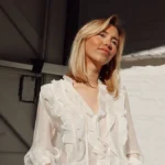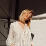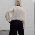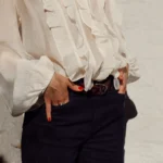 La blouse Amélie, au tissu fluide, à la teinte blanc cassé et aux volants légers. Une pièce conçue pour celles qui aiment la légèreté.